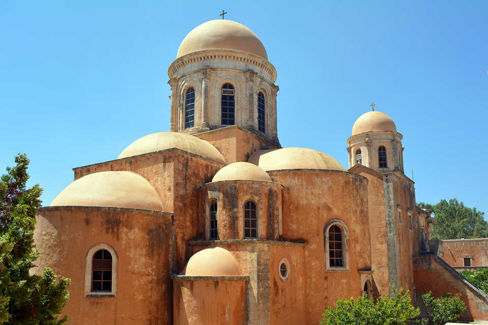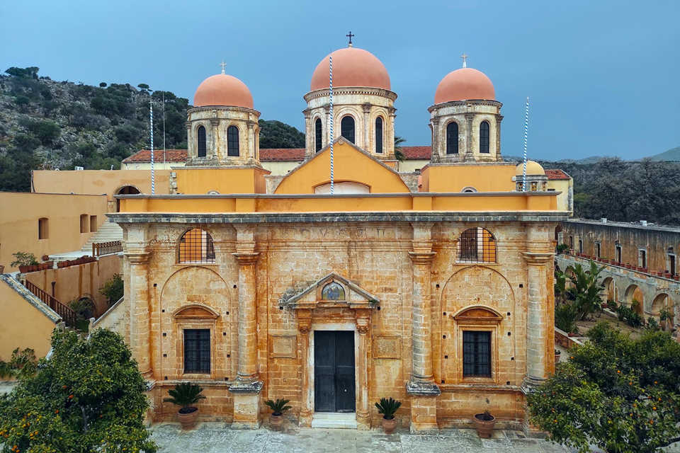Closed on Wednesdays and Fridays, this rust-colored, red-tile-roofed enclosure is a few kilometers south of the north shore of Akrotiri, and 20 km northeast of Chania. Its perimeter walls (actually they're long, narrow buildings), into which the monks' cells are built, also served as defensive walls. It has towers on its corners and an open courtyard measuring 30 x 40 meters. In the courtyard are a few mature trees and masonry-lined beds for flowers and ornamental plants. Dominating the courtyard is the Venetian-inspired quasi-Baroque facade (complete with carved gargoyle faces at the bases of its columns) of the domed church, dedicated to the Virgin Mary.