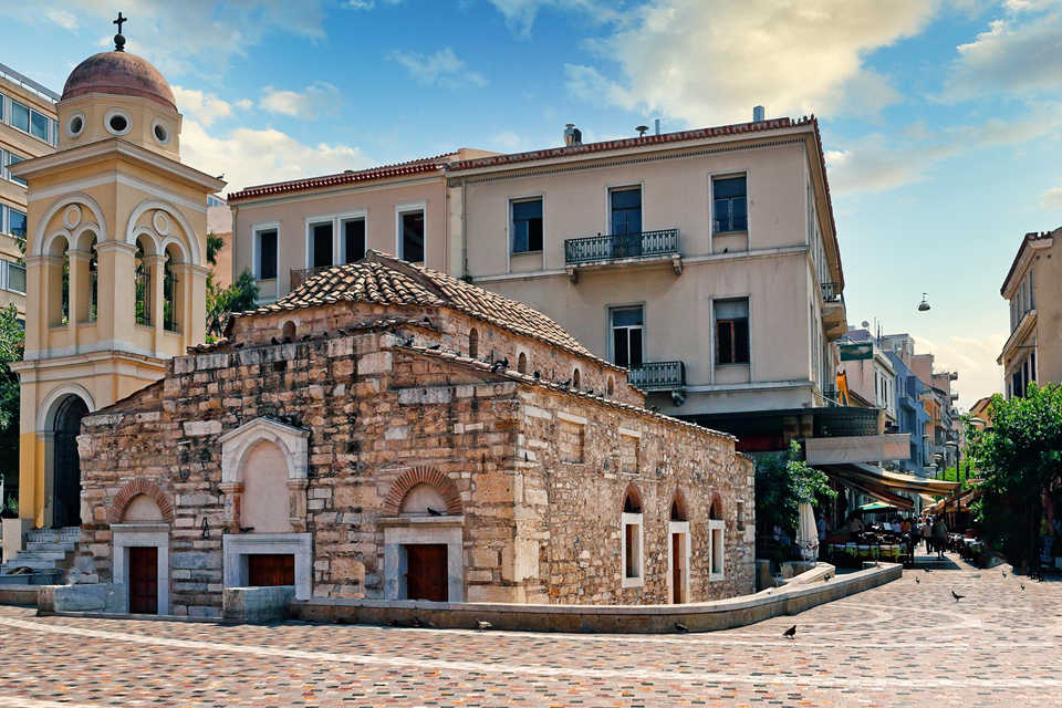 The Church of the Panagia Pantanassa (of of the Dormition- “Falling asleep-”of the Virgin Mary), on the east side of the Square, was once part of a larger monastery. Recent excavations for the Metro have uncovered floor mosaics dating from the 5th century and some foundations of nearby shops or houses. The monastery was referred to as the “Big Monastery” during the 17th century. The bell tower was a relatively recent addition, dating from 1911. It was one of Athens’ most important places of worship. After extensive changes took place in the late 19th century, when many of the outbuildings of the monastery were torn down, partly to make room for the 1895 construction of the Metro station, it was known as the Monastiraki, or “Little Monastery.” The cells of the monastery had been built on what is now the open area of the Square. The church’s foundations are well below the level of the Square, and is surrounded by a low protective wall.