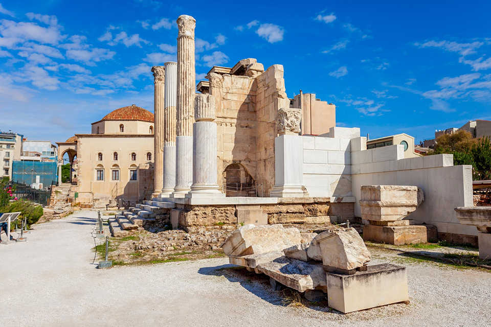 Near the southern point of the Square is the Tsistratakis Mosque, dating from 1759 and now serving as one of the locations of the Greek Museum of Fold Art, housing a collection of pottery. The mosque was named after the Ottoman governor of Athens, who supervised its construction but then lost his job went it was revealed that he had ground up columns from the next-door Hadrian’s library to provide lime for the mosque’s construction. The objection was the use of a pagan structure to build a Muslim holy building. The mosque’s minaret was torn down after the 1821-32 War of Independence. The domed building has a triple-domed porch supported but four columns and three arches.