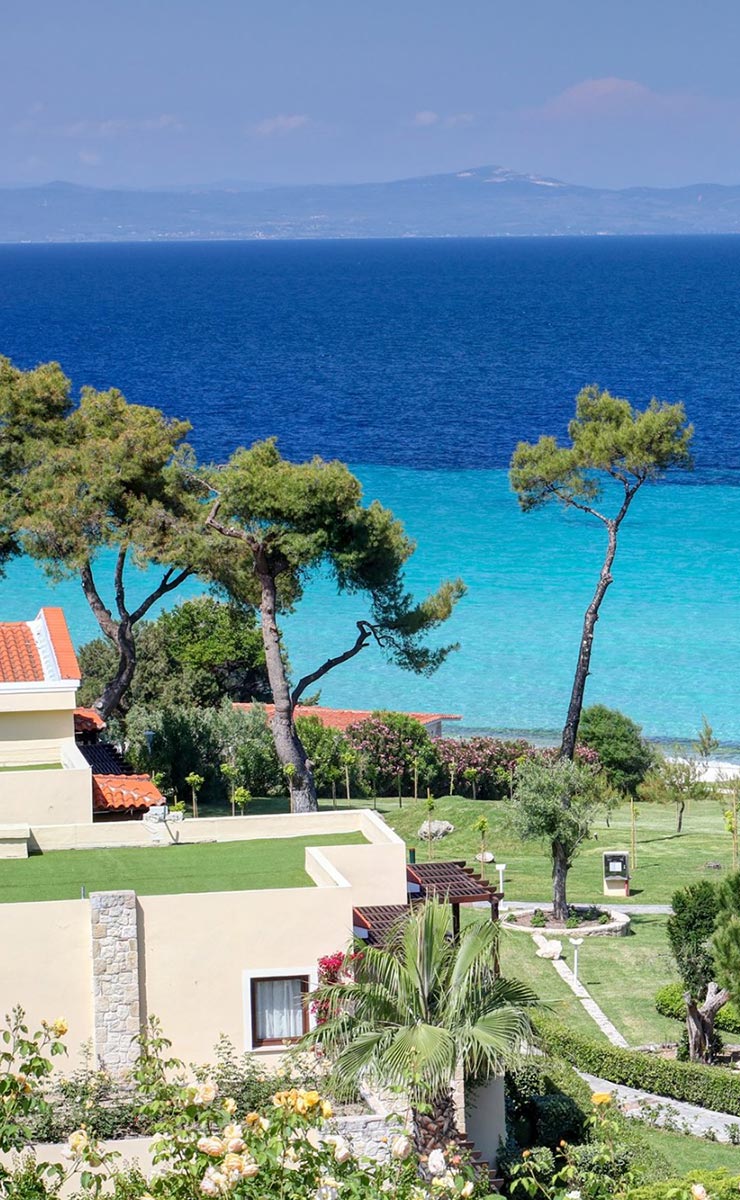 Pool View looks inward to the grounds and one or more of the half dozen pools and the activity there. Sea View enables you to have the calming vista of sunrises over the Toroneos Gulf and the hills of Sithonia, the middle peninsula of Halkidiki, some 25km distant.