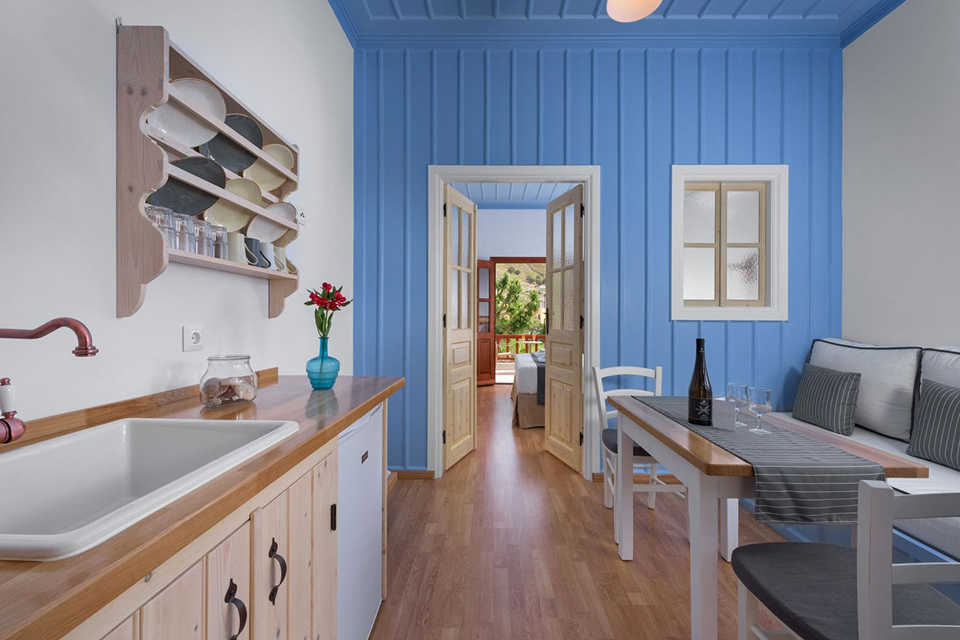 The Superior Apartments of AˑSymi Residences on the ground floor are suitable to accommodate 2 guests in its tastefully decorated premises. The soothing view of the sea from your private veranda and the relaxing sleep on the Coco-Mat beds makes your stay in the Superior Apartment amazingly comfortable.