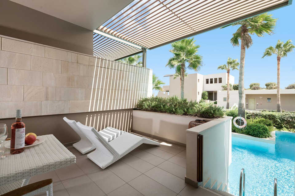 The Hotel itself has 328 luxury rooms and suites, 118 shared and private pools, 3 outdoor adult pools and 3 childrens’ pools, easy beach access, 2 buffet and 4 a la carte restaurants, 4 bars, a uniquely-designed spa and fitness center with heated indoor pool, an open-air amphitheatre, a childrens’ playground, 2 tennis courts, a private chapel, a mini market, and a hair salon, amongst other amenities. The architecture is based on traditional Minoan methods, with 21st century comfort and amenities. The hotel is an ideal place for both couples and families.