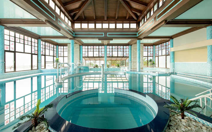 It offers 344 rooms. There are 5 seawater pools, which is a rarity in most resorts. Seawater, with its rich mineral content, has been consistently shown to be the best water for joints and muscle pain. The resort’s award-winning Cretan Village Thalosso Spa also boasts and indoor seawater pool, with a number of hydrotherapy and hydroexercise options on tap.