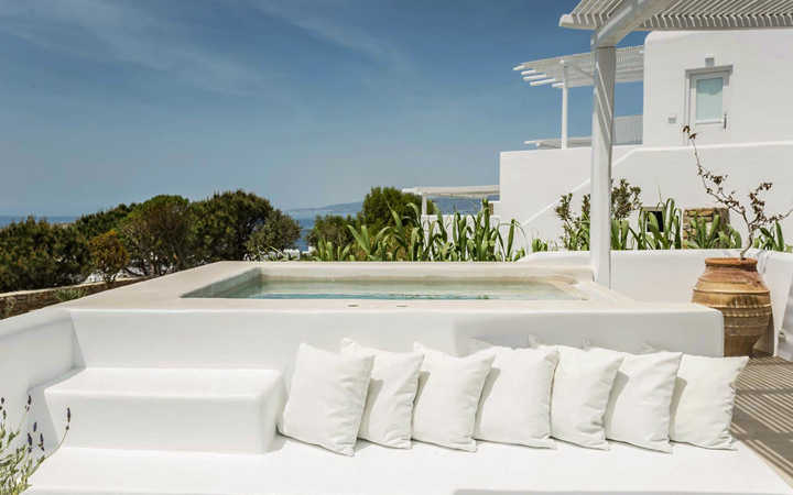 Ostraco Suites rooms are individually decorated to reflect the distinctive Mykonos Island aesthetic of all-white surroundings, with an occasional dash of color to stimulate the senses. It features a relaxing sun terrace with a beautiful swimming pool, a stylish cocktail bar, and a restaurant that can be turned into a great venue for parties night or day. The hotel has two traditional Greek chapels for wedding and religious services. The hotel contains spa treatment facilities with the choice of private in-room therapies.
