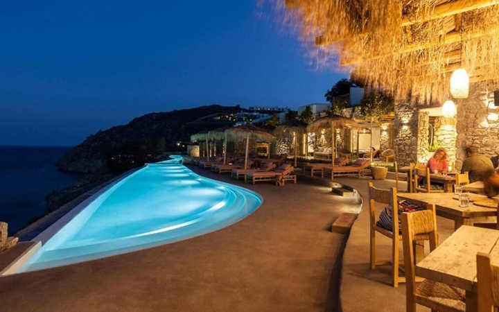 The Wild is a 5-star boutique cliff side hotel on the less-developed southeast coast of Mykonos, in an area known locally as Kalafatis. It offers 40 suites and villas, and an all-day pool bar where you can sip your favorite beverage whilst taking in the panorama of dazzling Agia Anna Bay and the greater Med and watch the yachts sail in and out of the area.