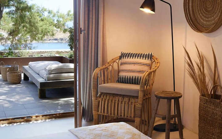 This suite has a wooden room divider, beamed ceilings, Cycladic-style vases, chairs and tables, and a fantastic view of the sea just a few meters away. The look is beautifully spare, elegant, and efficient.