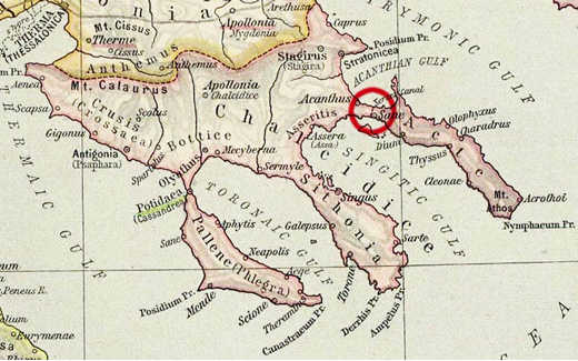 Ущелье вблизи посёлка Неа Рода, где раньше располагались подворья афонских монастырей и средневековые башни. Канал здесь Ксеркс открыл в 481 году до н.э. с тем, чтобы персидские корабли могли проходить из залива в залив, избегая Афонского полуострова.