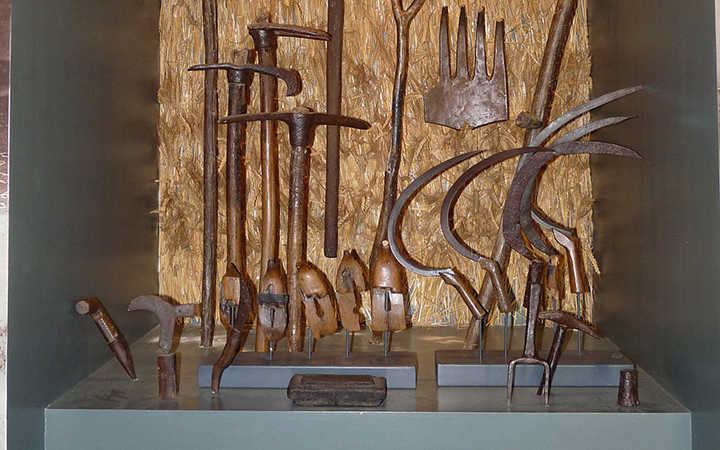 Этнографический музей разместился в прохладных помещениях каменного двухэтажного дома, в котором жила прежде зажиточная семья Арнеа. Начало экспозиции на первом этаже открывает уголок, в котором – всё то, что нужно для приготовления хлеба, в том числе элементарный жернов. Стенд с вилами, серпами, граблями и прочими инструментами, используемыми при уборке зерновых и покоса травы. Медовый уголок – самый интересный. Здесь много образцов ульев, приспособления для качки мёда, рамки, окуриватели. В дороге мы часто замечали кочевые пасеки: небольшие цветные улья выставляют в определённых зонах, богатых цветущими деревьями и травами, потом на машине их перевозят в другие места.