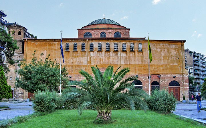 Небольшой византийский храм с наклонным куполом, расположенный на стыке улиц Эгнатия и Палео́н Патро́н Герману́, был построен в середине XIV века